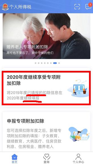 值得注意的是:對于任職受雇單位發(fā)生變化的或者??坌畔a(chǎn)生變化而沒有及時修改的納稅人,有可能會影響其繼續(xù)享受??坌畔⒒蛘哂绊懫浼{稅信用。同時,還明確了:除特殊情形外,將取消電子模板方式填報專扣信息!如您2019年已填報過專項附加扣除信息并需要在2020年繼續(xù)享受,請及時關(guān)注相關(guān)信息是否發(fā)生變化(首頁【專項附加扣除】—【扣除年度】選擇“2020”—“快捷填報”欄【一鍵帶入】);如有變化,請及時修改。如您未曾填報過專項附加扣除信息但2020年有符合條件的專項附加扣除可以享受,請您及時在首頁相應(yīng)專項附加扣除項目欄(【立即填報】—【扣除年度】選擇“2020”)進(jìn)行填報。進(jìn)入App,點擊“確認(rèn)2020年度專項附加扣除”