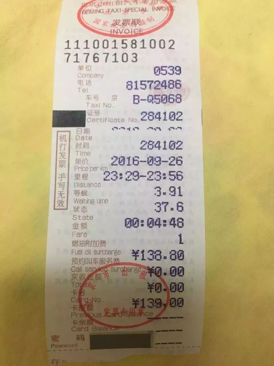十四、收到一張印有舊版發(fā)票監(jiān)制章的出租車發(fā)票。